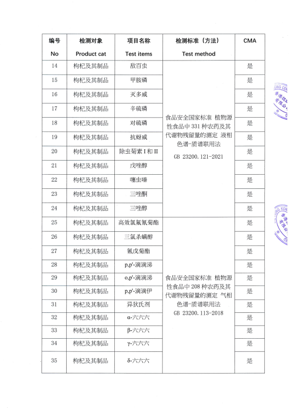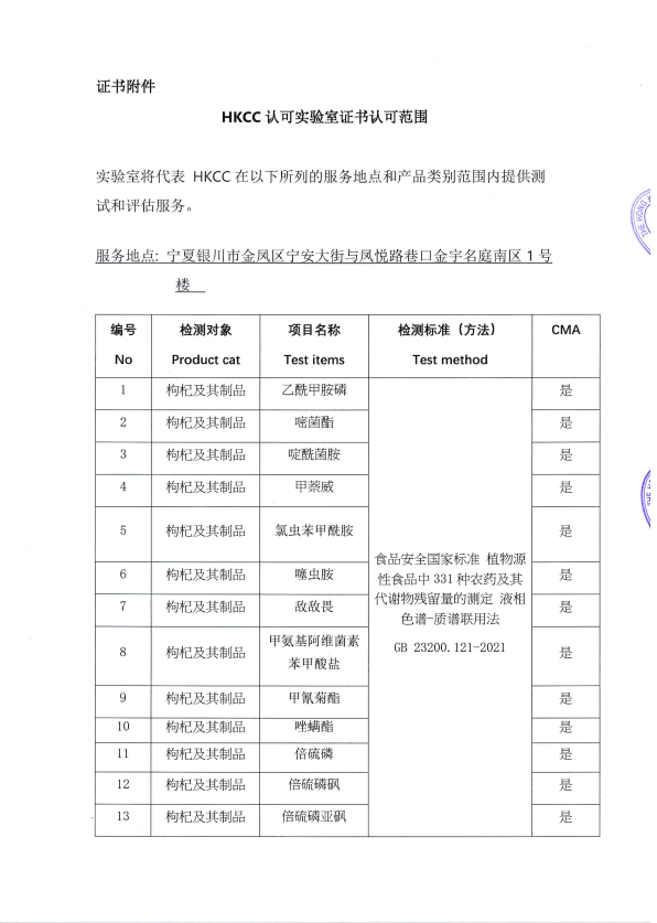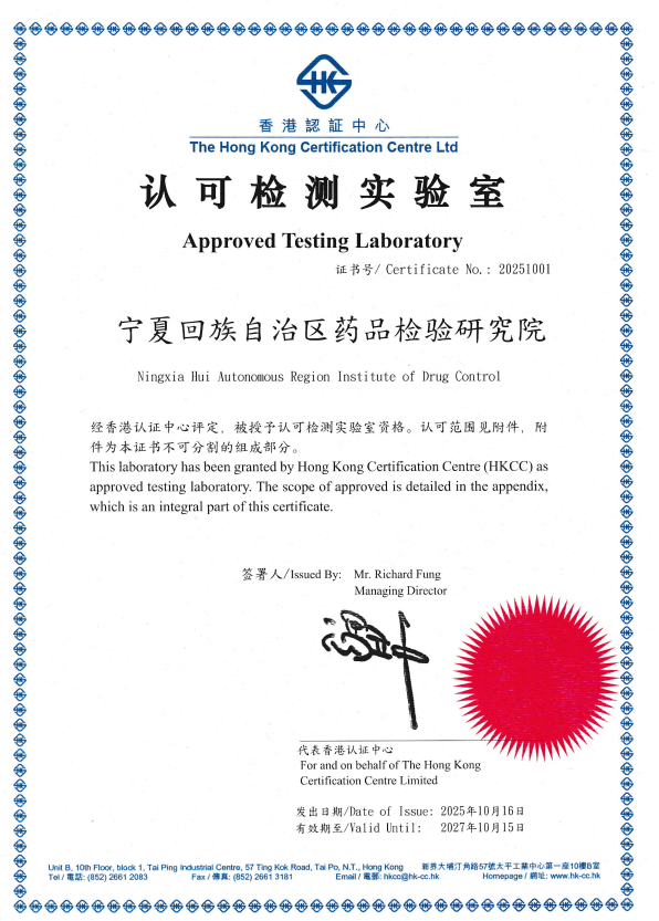 自2023年8月25日和香港STC签订《技术合作协议》以来,宁夏药品检验研究院不断强化国家枸杞产品质量检验检测中心(宁夏)能力建设水平,在扩充枸杞产品检验检测能力的同时,积极推进与香港STC公司检测数据互相认证认可,通过开展线上技术交流会、技术审核等系列活动,从多方面考察双方实验室47个参数的检验检测能力,最终通过了第二批47个参数的认证认可,获得了香港认证中心的认可检测实验室证书和认可范围。