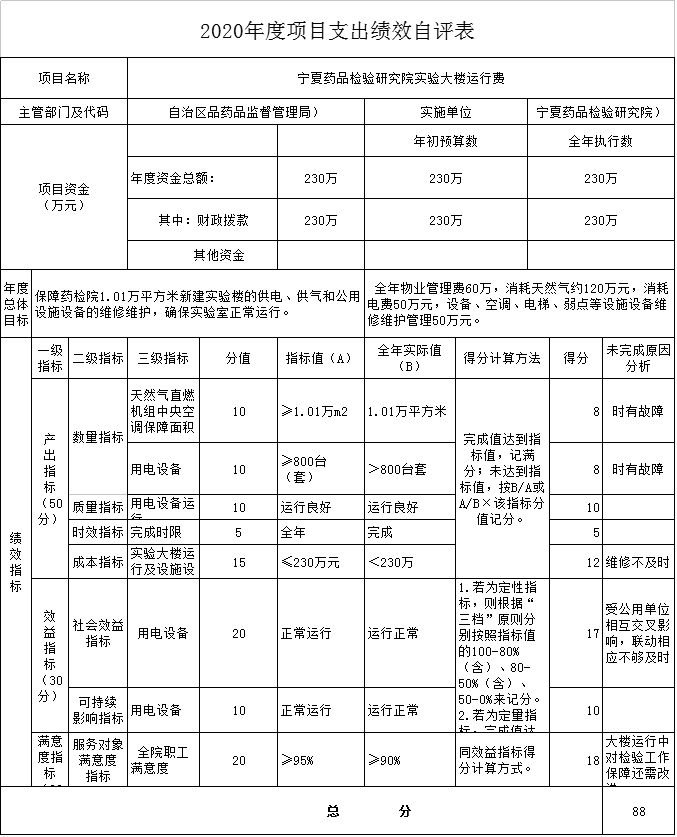 (1)实验大楼运行费项目自评得分为88分。该项目保障药检院1.01万平方米新建实验楼的供电、供气和公用设施设备的维修维护,确保实验室正常运行。存在问题是受公用单位相互交叉影响,联动相应不够及时。大楼运行中对检验工作保障还需改进,下一步加强管理,保障正常运转。
