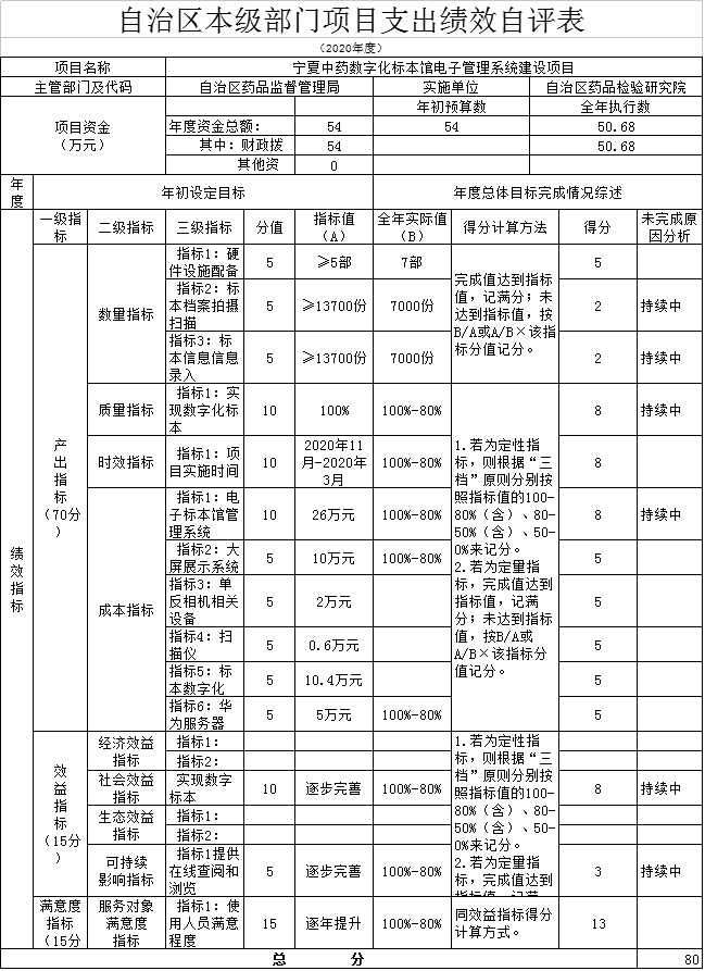 (2)宁夏中药数字化标本馆电子管理系统建设项自评得分为80分。该项目标本档案拍摄扫描及数字化信息导入工作,工作量大要求高,该项目2020年未完成验收,工作持续进行中,2021年项目完工。