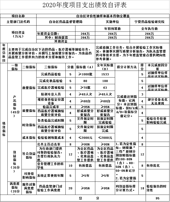 (3)自治区评价性抽样和基本药物全覆盖项自评得分为95分。该项目主要是按计划完成省抽工作任务,结合开展检验工作实际情况,依据事实撰写质量分析报告,为执法监管提供可靠技术支撑,为下年度监管重点提供靶向性参考依据。2020年该项目全部完成,存在问题是部分检验设备老化影响了工作的及时性,业务工作的科学性有待优化。